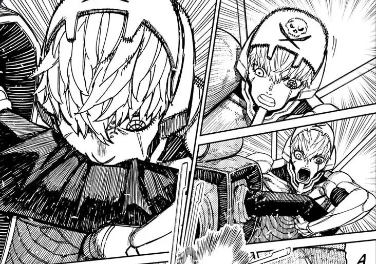 Okarun bales gigitannya dengan pile bunker mid-air, tapi si alien ternyata bukan ras Kur seperti yang kita kira! Saat dia buka helmnya, wajahnya beda—dan ini bikin Okarun kaget.