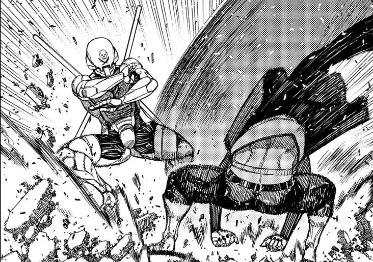 Satu tendangan presisi dari alien ini membuat tangan Okarun kena nanoskin, yang udah dikasih warning sama Kinta buat nggak disentuh sembarangan. Efeknya? Armor Okarun langsung KO.