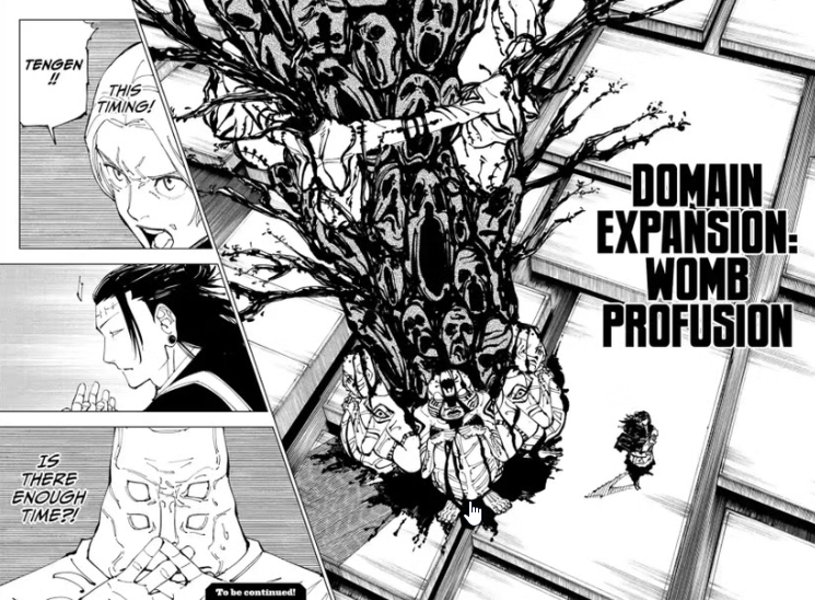 Kenjaku, antagonis utama seri ini, sempat memperlihatkan Domain Expansion-nya yang bernama Womb Profusion. Domain ini menampilkan pilar raksasa yang terdiri dari roh terkutuk yang dikumpulkan melalui teknik Geto. Namun, efek detail dari domain ini tidak dijelaskan secara eksplisit. Yang terlihat hanyalah Yuki Tsukumo mengalami luka parah saat terkena dampaknya. Dengan gaya tanpa penghalang seperti Malevolent Shrine milik Sukuna, Domain Expansion Kenjaku tetap menyimpan banyak misteri.